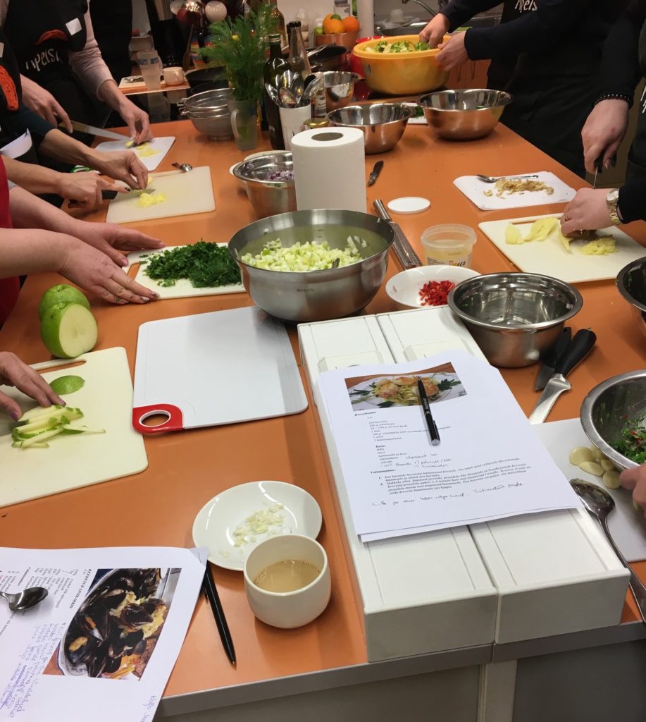 Olen käinud kahel korral Tallinna Rahvakülikooli kokandus kursustel. Esimesel korral õppisin ekleere tegema. Kohapeal tulid muidugi ideaalsed ja kui kodus järele proovisin, siis mitte… 😀 Tegelikult aga sain tagantjärele aru ka, kus ma võisin omadega “mööda panna”, seega tasub kindlasti uuesti katsetada. Teisel korral oli teemaks “mereannid”, mis mulle väga meeldivad (välja arvatud igasugune valge kala). Sai taaskord häid kasulikke mõtteid ja nippe ning kuna tegime ikkagi terve suure õhtusööma toidulaua, siis ei koosnenud see vaid merandidest, vaid ka toitudest mis sinna kõrvale võiks sobida, seega sai tõesti palju ideid juurde toidu tegemisel. Tänase postituse lõppu panengi toredaid toidupilte 😛