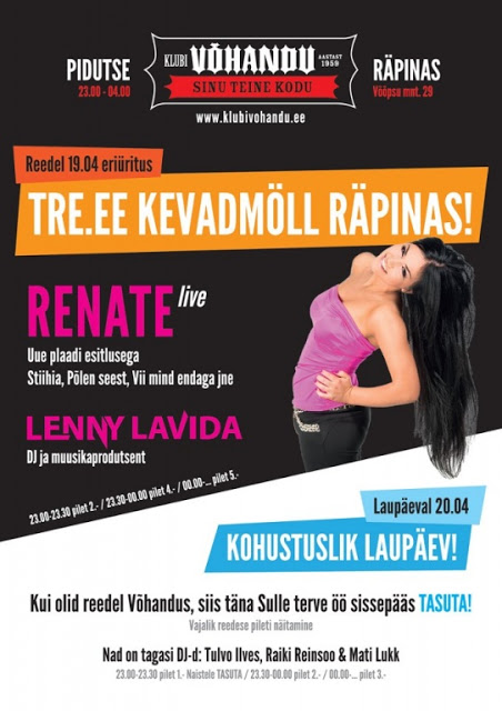 Täna sõidan Räpinasse esinema. 18:30 hakkame liikuma ja alates 21:30 saab seal proovi teha. Ehk saan peale proovi visata kuhugi lava taha end veidiks ajaks pikuli, sest tagasi saame sõita alles alates viiest, seega Alppu jõuan umbes kaheksa paiku, kui ma üldse lähen Alppu, sest pool 10 pean juba Paides juuksuris olema, umbes ühe paiku jõuan Alppu tagasi, siis saan puhata paar tundi ja kella kolmest hakkan Tartu sõitma, kus 17:00 on liveproov ja u. 19:30 esinemine, sealt edasi Võrru, Club Tartusse, kus esinen umbes 2 öösel. Ja siis 3 tundi koju sõitu.
